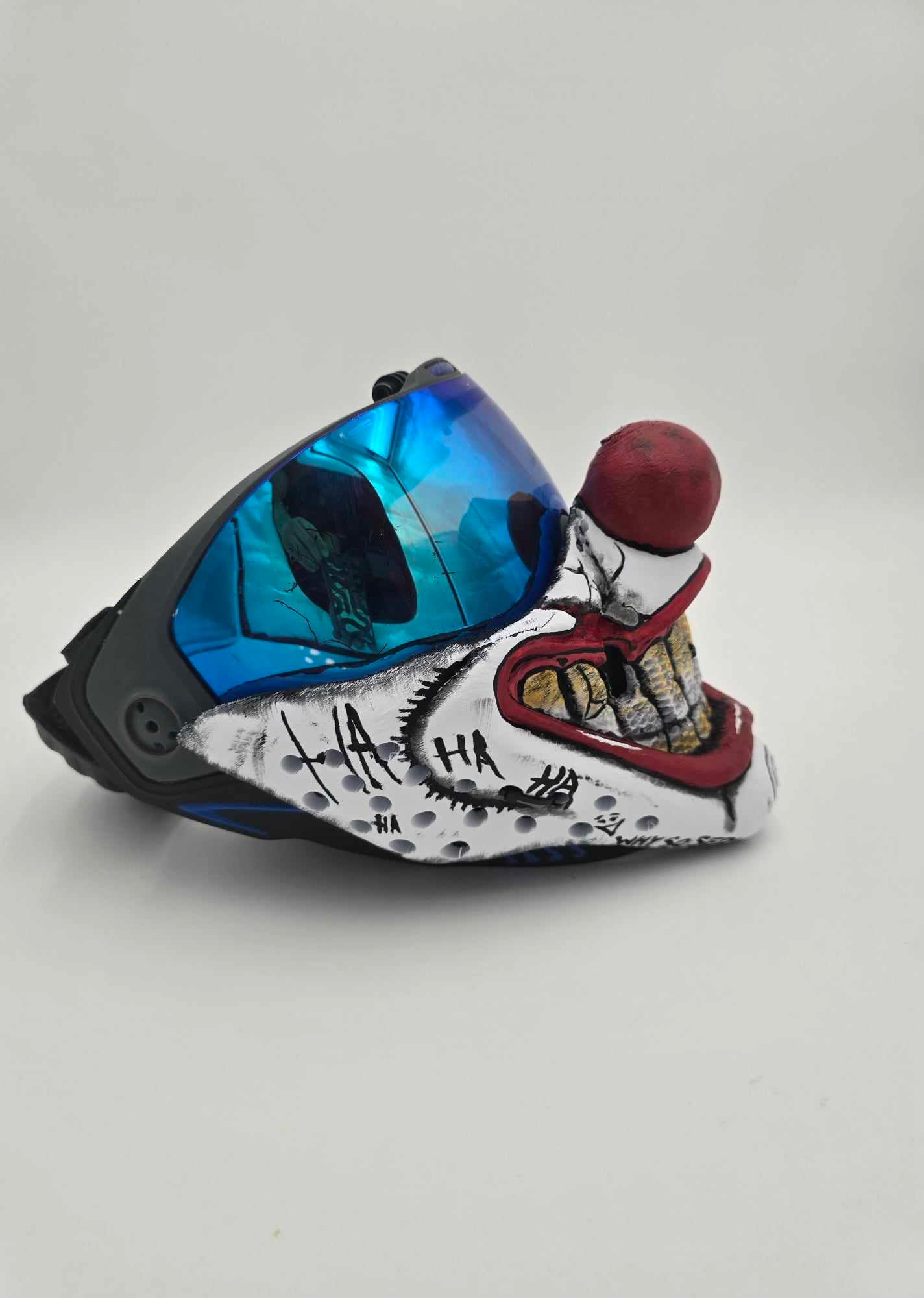 Add this Sweet tooth/ Joker collab to your Paintball mask collection arsenal. Custom painted with comic inspired art. Popular item to purchase for Clowns vs Zombies.
